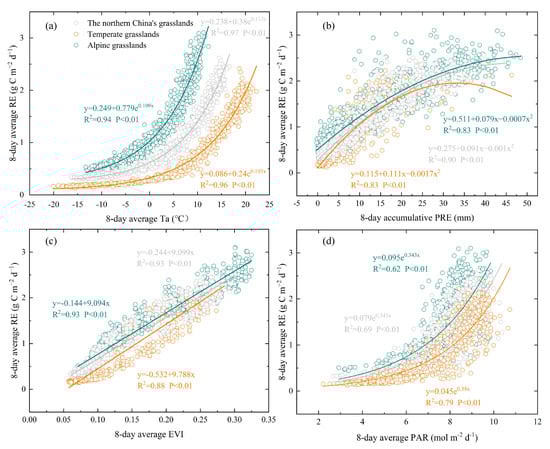 Seasonal dynamic correlation between RE and (a) Ta, (b) PRE, (c) EVI, and (d) PAR at eight-day timescale from 2001–2015 in the northern China’s grasslands overall, alpine grasslands, and temperate grasslands, respectively.