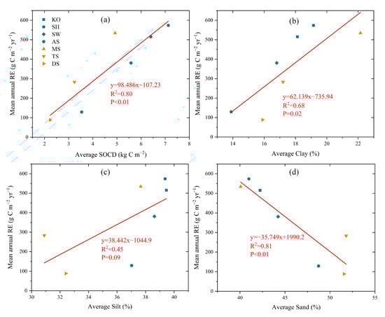 The correlation between the mean annual RE and (a) average SOCD, (b) average clay content, (c) average silt content and (d) average sand content for all grids in each grassland subtype.