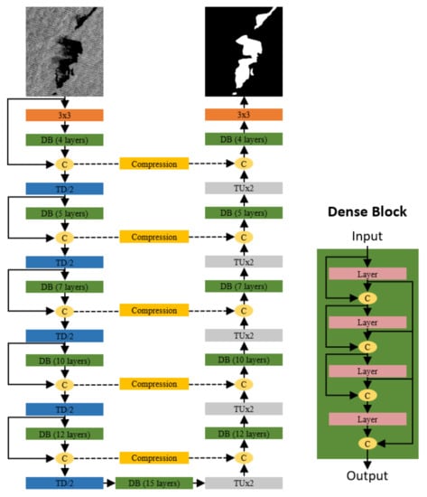- Jégou, S.; Drozdzal, M.; Vazquez, D.; Romero, A.; Bengio, Y. The one hundred layers tiramisu: Fully convolutional densenets for semantic segmentation. In Proceedings of the IEEE Conference on Computer Vision and Pattern Recognition Workshops, Honolulu, HI, USA, 21–26 July 2017; pp. 11–19. [Google Scholar]