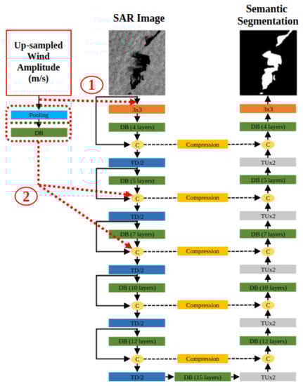 - Late fusion: The SAR and wind modalities are considered as two specific input channels with their separate layers before their fusion. In this approach, while keeping the enhanced FC-DenseNet structure for the SAR data, the wind modality is introduced in subsequent dense blocks along the model encoding path. The merging process is performed after the second or third block so that the wind features at their original scale are fused with the SAR features when the latter reach a similar resolution after a few downscaling steps along the encoding section. As for the general DenseNet approach, this fusion operation consists of concatenating the features of each channel. Regarding the processing of wind channels, several strategies can be investigated. In this paper, we consider two approaches: (i) applying a simple average pooling to adjust feature scales and (ii) applying mean clustering and then extracting higher-level features with a dense block.