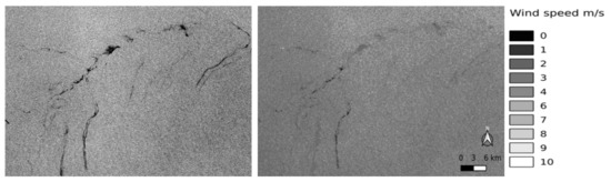 CMOD5 estimates the radar backscatter in a scene as a function of the surface wind speed (V) and the angle that the wind makes with respect to the direction of the pulse () and the incidence angle () [51]. However, for surfaces such as slick areas, the wind speed is underestimated due to the wave damping effect. This discrepancy has been considered at the model performance assessment step.In our context, SAR and wind resolutions are 10 and 100 m per pixel, respectively, such that wind is upsampled by a factor of 10 using linear interpolation when required. An example of a Sentinel-1 SAR image before and after adaptation to CMOD5 is shown in Figure 8.