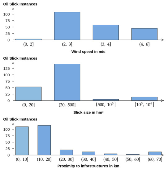 In oil slick detection, numerous studies have emphasized the importance of contextual information as the main factor impacting the monitoring of offshore oil slicks using SAR imagery. The study proposed by Brekke et al. [4] highlights the interest in weather conditions, distance from ships, and infrastructure position (platform, pipeline, etc.). Meteorological weather conditions are emphasized, namely wind speed, which affects the oil slick profile (oxidation, biodegradation, dispersion, sedimentation, etc.) and changes its characteristics (size, shape, etc.) [14]. In addition, wind speed impacts the backscatter contrast between the sea and slick areas. On the one hand, oil slicks tend to scatter gradually into smaller parts at moderate wind speeds and disappear as wind speed increases. On the other hand, local low wind speeds can generate areas of low backscatter and, therefore, lookalikes [15]. Observing the effect of wind on slick characterization reveals the apparent importance of this information in the slick detection and characterization process.
