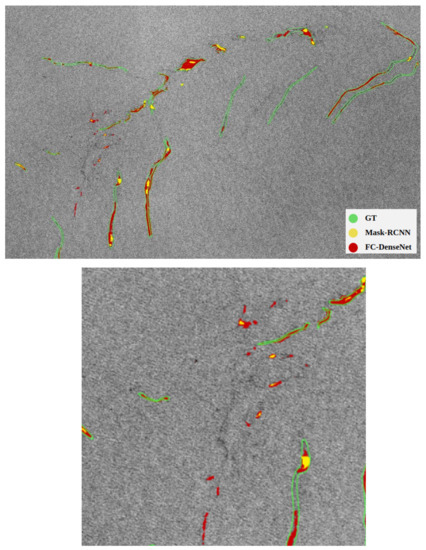 Since the goal is to find the precise location of oil slicks in SAR images, standard object detection methods are not appropriate because they commonly provide object bounding boxes that may be too large compared to the thin oil slicks to be detected. In this case, the segmentation of oil slick instances is more relevant. Such a strategy opens wide doors to a variety of approaches. In this work, a comparison is made between a convolutional neural network, for instance, segmentation: Mask Region-Based Convolutional Neural Networks (Mask R-CNN [32]) with object segmentation capability and a semantic segmentation neural network Fully Convolutional DenseNet (FC-DenseNet [33]). Instance and semantic segmentation methods are comparable in this case study since we do not face occlusion issues of oil slicks on the sea surface. Consequently, applying connected components to the semantic segmentation predictions yields instance segmentation.