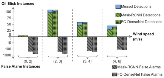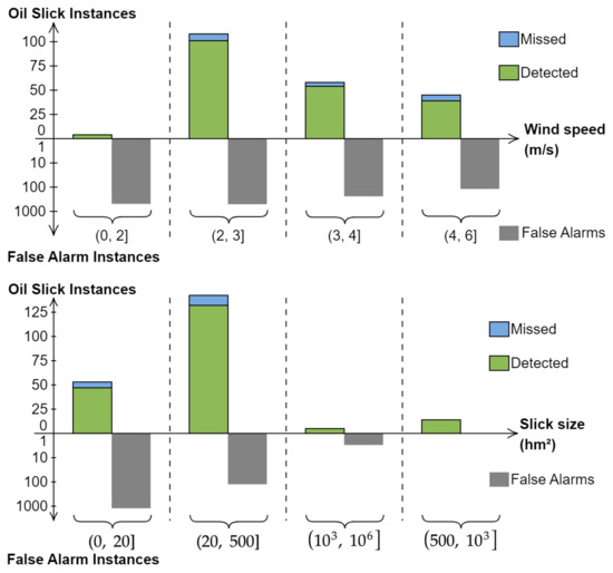 Moreover, during oil slick manual detection by the photo-interpreters, the evaluation can be adjusted by taking the instantaneous wind speed into account. According to Fingas et al. [3], the wind speed range for oil detectability is (1.5 m/s, 6–10 m/s). Beyond this range, the oil signature will be further removed. The most accepted limits are 1.5 to 10 m/s. La et al. [16] and Brekke et al. [4] have further refined this range, a summary of which is provided in Table 1. However, it may remain specific to small-scale, local studies that do not permit generalization. As a general rule, these experiments report the requirement for moderate wind speeds. This paper considers a trade-off between the proposed wind speed ranges that seems relevant to our large-scale study.