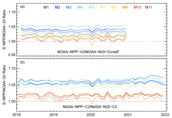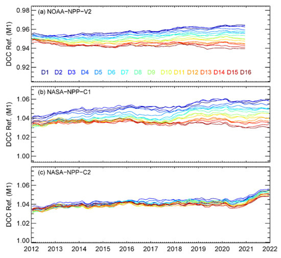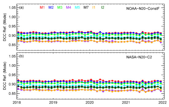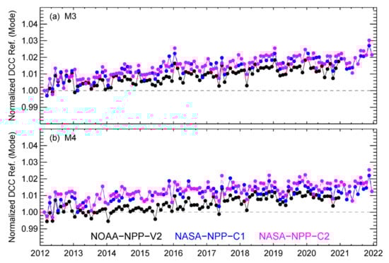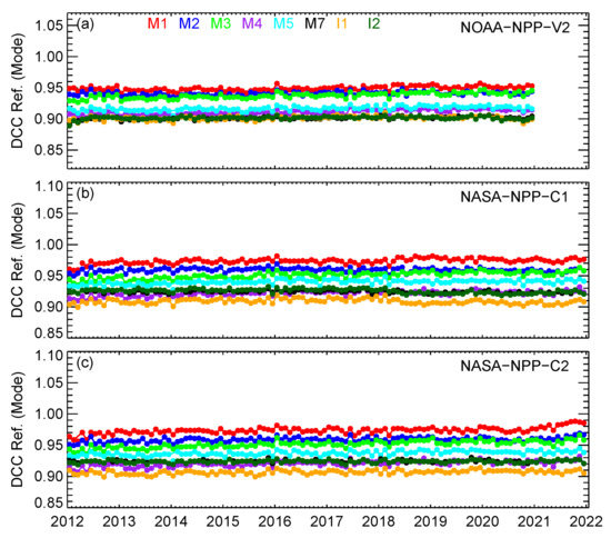 Moreover, relatively larger separations between the NOAA-NPP-V2 and NASA-NPP-C1/C2 M4 normalized DCC time series were observed from mid-2013 to early 2017. The root cause of the separations is still unknown. Our previous study indicated that NASA-NPP-C1/C2 F-factors in the beginning of the mission show larger curvature, while NOAA-NPP-V2 F-factors are more flat [5]. The F-factor difference may cause a separation of the DCC time series after they are normalized to the first point. Moreover, NOAA-NPP-V2 DCC time series were generally stable during 2013–2015, while the NASA-NPP-C1/C2 DCC time series showed gradual trends during the same period. We will further investigate the root cause in the future.