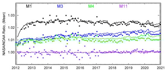 NASA-NPP-C2/NOAA-NPP-V2 ratio time series for bands M1, M3–M4, and M11: filled cycles (DCC ratio) and solid lines (F-factor ratio).