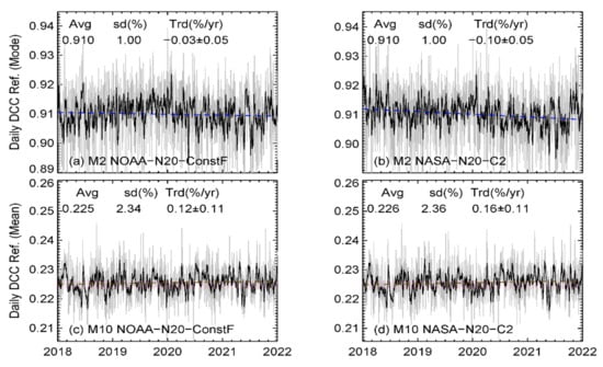 Figure 6 shows examples of the daily DCC time series for bands M2 and M10. Raw daily DCC time series are shown by gray lines. Black lines are moving averages with a window size of 7 days to better reveal the time-dependent trends in the daily DCC time series. Overall, there is no significant trend in the NOAA-N20-ConstF M2 daily DCC time series, while NASA-N20-C2 M2 shows a relatively larger downward trend of −0.10%/year, exceeding the uncertainty level. The NOAA M2 daily DCC time series also revealed that the trends vary with time, with a smaller upward trend during 2018–2019, a small downward trend in 2020, and mostly flat response in 2021. M10 SDRs generated by NOAA and NASA are close to each other, with a small upward in the daily DCC time series (0.12%/year for NOAA-N20-ConstF and 0.16%/year for NASA-N20-C2).