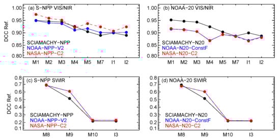 We also studied the inter-channel calibration consistency of the VIIRS RSB SDRs using SCIAMACHY spectra-derived DCC reflectance (convolved over VIIRS RSRs) as a reference. Figure 9 compares the VIIRS DCC reflectance with SCIAMACHY DCC reflectance for different NOAA-20 and S-NPP RSBs. The results for NASA-NPP-C1 are similar to that of NASA-NPP-C2; therefore, they are not shown. Note that NOAA-N20-ConstF and NASA-N20-C2 agree well with each other. For VIIRS VIS/NIR bands, the multiyear averaged DCC reflectance was estimated using monthly DCC mode time series. For VIIRS SWIR bands, the multiyear averaged DCC reflectance was estimated using a monthly DCC mean time series. M11 is not covered by the SCIAMACHY spectra; therefore, it was not considered.