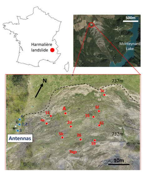 In the following section, we present the instrumentation of the experimental site and the methodology for data acquisition and processing. Section 4 provides theoretical background and experimental validation of the RFID measurement error in order to decide on ideal antenna positioning by optimizing the localization accuracy and phase ambiguity. Section 5 reports on an example of 12 months of surface deformation monitoring on the slow-moving Harmalière landslide.