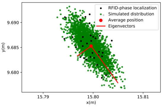 Extracting the eigenvalues and eigenvectors of allows for a completely analytical determination of the localization spot properties (especially the direction of highest error) for a given antenna-tag geometry, as shown in Figure 2. With a phase error of 0.04 rad, and at the given tag position, we expect a localization random error of about 1 cm. Note that in the model, any relative increase in phase error will result in the same relative increase in localization error, as the measurement operator is linear.