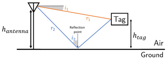 Multipath interference is a major challenge in RFID-localization and several solutions have been proposed to estimate, reduce or mitigate its effect on measurements [53,54]. To start investigating the multipath, we use a simple two-ray model, assuming that the measured signal is a superposition of the line-of-sight () signal and a signal reflected on the ground (), as shown in Figure 3. The two signals propagate over different path lengths and orientations, which translate in different received power values due to Friis’ law: