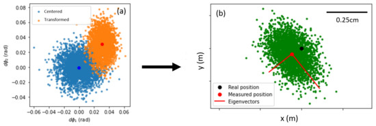Equations (14) and (15) represent our best attempt to model the deviation from an ideal LOS phase measurement, taking into account the various phase measurement errors, and the geometry of the system. Figure 4 presents a 2D schematic view of the measurement distributions from phase space to displacement space. We see that the phase distribution is scaled and translated in phase space, compared to the centered distribution that was set in Equation (8). In displacement space, this gives a specific localization spot with covariance , translated from the true LOS measurement by vector . The specific values of and are discussed in Section 4.2.
