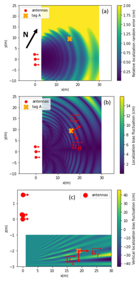Mapping of the 2D localization error extracted from Equations (14) and (15), simulating the geometry of the Harmalière setup. The red dots represent the reader antennas, and the arrows show the principal antenna directions. The orange cross indicates the position of tag A. The vectors ) define the cylindrical coordinate system used later on. (a) The colormap shows the random localization error (maximum dimension of the localization spot) up to 2 cm, related to the phase random deviation . The localization bias is not shown. (b) Color-mapping of the systematic localization bias (related to ) in the xOy plane shows oscillations with meter-order spatial frequency and increasing amplitude with distance from the measurement system. The random localization error is not shown. (c) Color-mapping of the systematic localization bias in the xOz plane, with higher oscillation amplitude and frequency. The ground is located at z= −3 m.