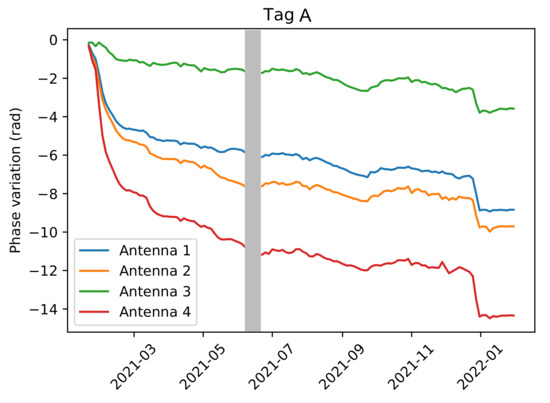 Unwrapped phase variation for tag A, measured by four antennas at a frequency f = 865 MHz, from January 2021 to February 2022. The grey bar shows a period of missing data due to hardware failure. Data was directly available after replacement of the malfunctioning device.
