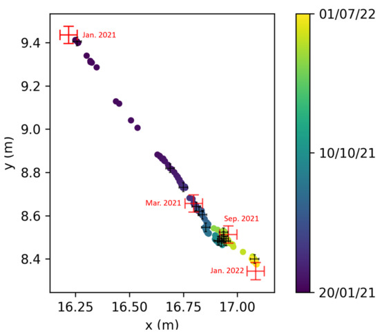 RFID localization in the xOy plane, using phase data for tag A (Figure 6). The total displacement is about 1.6 m. The color plot represents the time evolution of the RFID relative localization. The red crosses represent the reference measurements using a tacheometer, with an estimated error of about 4 cm. The tacheometer measurement of March 2021 is set as an absolute reference for relative localization. The black crosses correspond to the estimated random error bars for TD-phase localization (calculated via the model developed in Section 4.2).