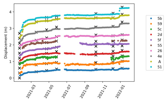 Cumulative 2D displacement norm for each tag, with reference measurements performed via tacheometer (black crosses). An offset was added to every plot to increase readability. The total displacement values are given in Table 3.