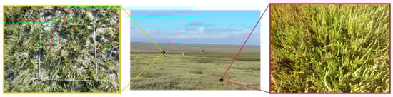 Westward view of the study area from the uppermost part of the salt marsh. The zoomed pictures show a detail of Sporobolus maritimus—predominant vegetation of the low marsh—(left) and Sarcocornia spp.—predominant vegetation of the medium marsh—(right).