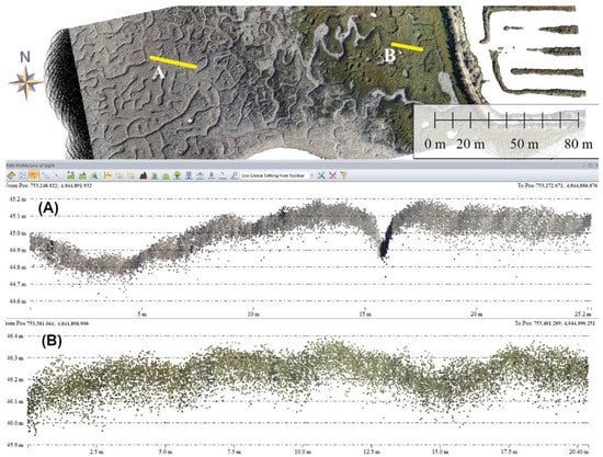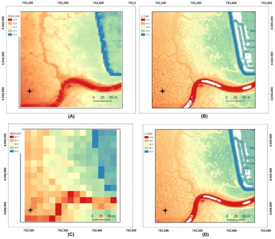 DEMs are created only with points of the ground class. To identify the true ground points, the general practice is to use only the minimum values of the LiDAR point clouds. However, this method is inefficient in salt marshes, where true ground surfaces generate broad point distributions, underestimating the elevation of bare areas [42]. To address this specific problem of salt marshes, the true ground has been classified using the mean values of the cloud points instead of minimum ones.