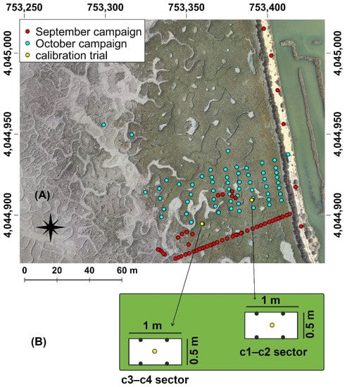 RTK systems are supposed to be highly accurate. However, the P1 and L1 sensors have centimetric accuracy (see specifications in Section 2.2, Table S1). Therefore, it is necessary to quantify the accuracy of the products. For the accuracy of the products, the UAV sensor results are compared with ground control points (GCPs: blue, red, and yellow points in Figure 6A) measured in situ with a dGPS. For dGPS measurements, a LeicaGS18 GNSS RTK Rover was used, with horizontal and vertical measurement precision of 8 mm + 1 ppm and 15 mm + 1 ppm, respectively. In September 2021, the campaign included a total of 41 GCPs. Six of these GCPs were collected on the wall of the saline behind the sampling site. This provides a stable surface reference over time. In October 2021, the campaign included 63 GCPs (blue points in Figure 6A), with one of the GCPs on the wall of the saline and four GCPs at the calibration trial areas (two points per sector, yellow points in Figure 6B, Section 2.6). In this last campaign, the canopy height was also measured at the salt marsh GCPs.