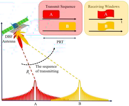 Synthetic aperture radar (SAR) is one of the most important imaging systems, since radar is independent of weather and environmental conditions [,,]. High-resolution and wide-swath (HRWS) imaging have been pursued by numerous scholars in recent years. On the one hand, more precise information can be acquired through higher resolution. On the other hand, better global observation capability can be achieved through wider swath [,,]. Due to the minimum antenna area constrain [,,], it is hard to improve the resolution and widen the swath concurrently for the traditional SAR [,]. To realize HRWS imaging, a series of methods and techniques have been proposed.