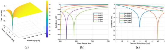 Based on the parameters of the spaceborne SAR system in Table 1, the relationship between the received gain loss and the slant range as well as the variation of the terrain undulation can be obtained as shown in Figure 3.