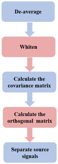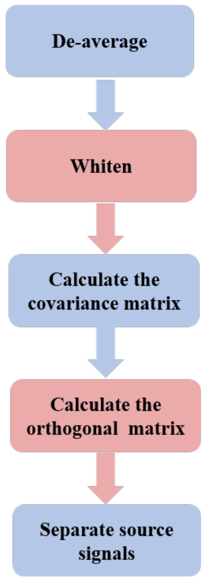 - Apply BSS to the mixed signal matrix and process it: de-averaging, whitening, solving the unitary matrix and joint diagonalization, as shown in Section 3.