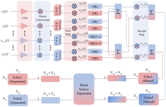 Proposed echo separation scheme. The echo signals received by the multiple sub-apertures simultaneously need to be amplified, down-converted, and sampled first. represents the element in ; denotes the element of . The transfer function of the FIR filter for the k th sub-aperture is . LCMV is used to perform the first step of separation; after the LCMV processing, the BSS is performed.