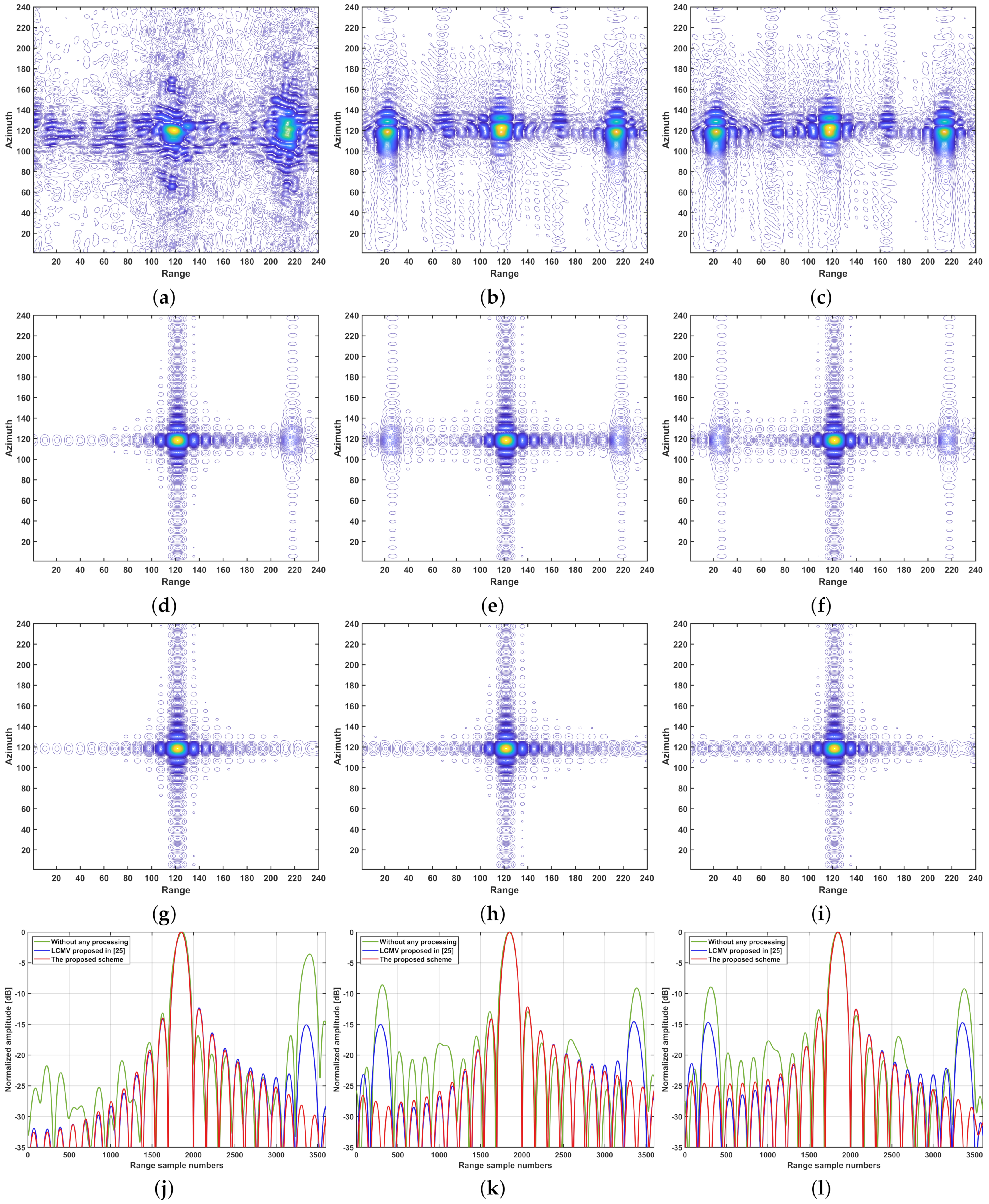 Echo imaging results. (a) Point A in sub-swath 1 without any processing. (b) Point B in sub-swath 1 without any processing. (c) Point C in sub-swath 1 without any processing. (d) Point A in sub-swath 1 using the method proposed in []. (e) Point B in sub-swath 1 using the method proposed in []. (f) Point C in sub-swath 1 using the method proposed in []. (g) Point A in sub-swath 1 with the proposed scheme. (h) Point B in sub-swath 1 with the proposed scheme. (i) Point C in sub-swath 1 with the proposed scheme. (j) Range profile of Point A in sub-swath 1. (k) Azimuth profile of Point A in sub-swath 1. (l) Range profile of Point B in sub-swath 1. Green, blue and red represents the results without any prosessing, with LCMV proposed in [] and with the proposed scheme, respectively.
