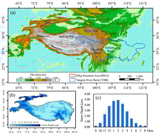 (a) Topography of High Mountain Asia (HMA) and the Yangtze River Basin (YRB), (b) distribution of winter snow depth in HMA from 1980 to 2019, and (c) monthly distribution of HMA snow depth from 1980 to 2019.