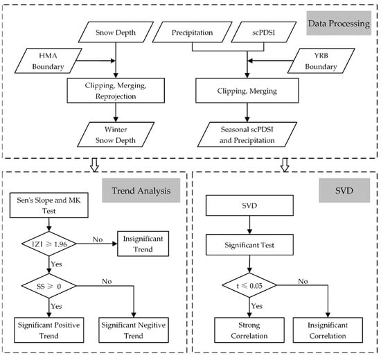 In this study, we first processed the original data, including clipping, merging, reprojection, and missing value processing, and finally obtained the data of HMA winter snow depth and precipitation and scPDSI of the YRB in each season from 1980 to 2019. Secondly, the trend analysis of scPDSI in each season in the YRB was made, the slope was calculated, and a significance test was carried out to obtain the spatial and temporal characteristics of drought and flood in the YRB. Then, an SVD analysis of snow depth in winter and scPDSI in spring and summer was conducted to find out the correlation between HMA snow depth and drought and flood in the YRB. Finally, an SVD analysis of snow depth and precipitation was made, and the difference of the relationship between snow depth and scPDSI and the relationship between snow depth and precipitation is discussed. The overall research process is shown in Figure 2.