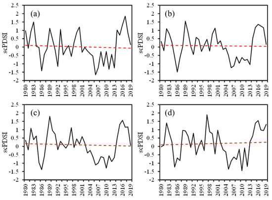 Self–calibrating Palmer Drought Severity Index (scPDSI) in different seasons in the YRB during the period 1980–2019. The red dotted line shows the trend. (a) Autumn, (b) winter, (c) spring, (d) summer.
