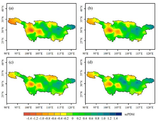 Distribution of scPDSI in different seasons in the YRB for the period 1980–2019. (a) Autumn, (b) winter, (c) spring, (d) summer.