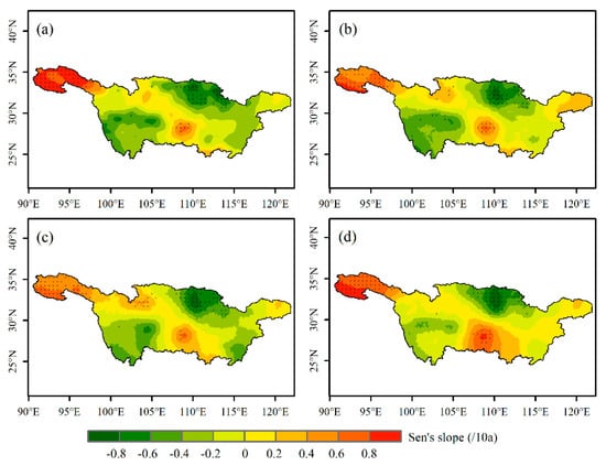 The scPDSI trend in each season was calculated, and its significance was tested (Figure 5). It can be seen that, although the scPDSI of YRB does not have a clear trend in Figure 3, the trend in individual regions is significant, and there is a great difference in different regions. The increase of scPDSI in the TP region at the source of the Yangtze River is the fastest, especially in autumn and summer, followed by the Dongting Lake Basin in the middle and south of the YRB. The decrease of scPDSI was mainly distributed in Yunnan–Guizhou Plateau and Hanjiang Basin, and the latter showed the fastest decline. The trend of scPDSI in the above areas all reached the 0.05 significance level.