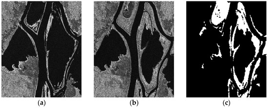 In this section, six real SAR image data sets are used to demonstrate the superiority of the method. Figure 2, Figure 3, Figure 4, Figure 5, Figure 6 and Figure 7 show the SAR data sets. Figure 2 is the Bern data set. They were taken in July 1999 and May 1999 by ERS-2. The image size and resolution are 301 × 301 and 20 m. Figure 3 is the Ottawa data set. They were taken in May 1997 and August 1997 by Radarsat-1. The image size and resolution are 290 × 350 and 12 m. Figure 4 is the Farmland data set. They were taken in June 2008 and June 2009 by Radarsat-2. The image size and resolution are 306 × 291 and 8 m. Figure 5 is the Coastline data set. They were taken in June 2008 and June 2009 by Radarsat-2. The image size and resolution are 450 × 280 and 8 m. Figure 6 is the Inland Water data set. They were taken in June 2008 and June 2009 by Radarsat-2. The image size and resolution are 291 × 444 and 8 m. Figure 7 is the Bangladesh data set. They were taken in April 2007 and July 2007 by Envisat. The image size and resolution are 300 × 300 and 10 m. A description of these data sets is shown in Table 1.