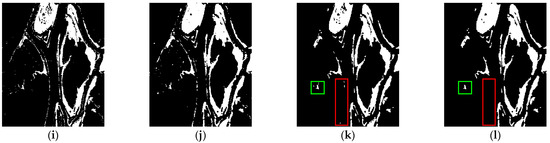 For DI analysis, we will take the Ottawa data set as an example. The images before and after change, saliency images, DIs, and change-detection results are shown in Figure 8. Figure 8a,b are the images before and after change, respectively. Figure 8c,d are the saliency image and binary image obtained by RMR DI, respectively. Figure 8e–h are R DI, MR DI, RMR DI, and SRMR-MSMR DI, respectively. Figure 8i–l are the change-detection results of these DIs, respectively. The evaluation indicators are shown in Table 2.
