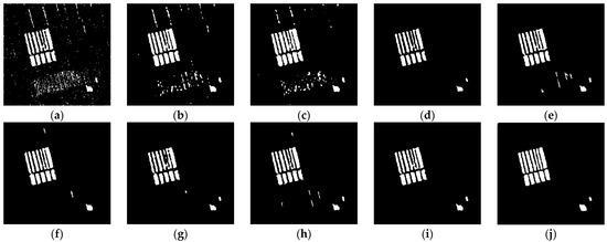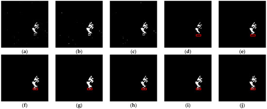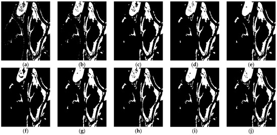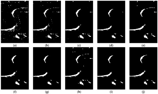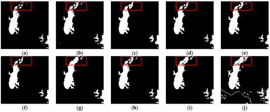 Change-detection results of the Coastline data set. (a) FCM; (b) FLICM; (c) PCA-KMeans; (d) PCANet; (e) CWNN; (f) MSAPNet; (g) RUSACD; (h) DDNet; (i) SRMR-MSMRFCM; (j) the ground truth.