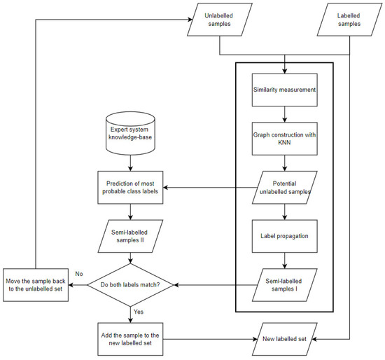 Algorithm 1 demonstrates the inputs, output, and steps of SSLES. In this algorithm, which is fully implemented in MATLAB_R2015b, the inputs are image objects with the respective set of features. Further, steps 1–4 are related to SSL which generates a graph based on image features and propagates the class labels to the potential unlabelled samples. In step 5, the developed ES performs an independent class label prediction on the semi-labelled samples of the SSL in step 4. Finally, if both the ES and the SSL agree on the same class label, the labelled sample is added to the training set; otherwise, it is returned to the unlabelled set. The flowchart of the algorithm is presented in Figure 2.