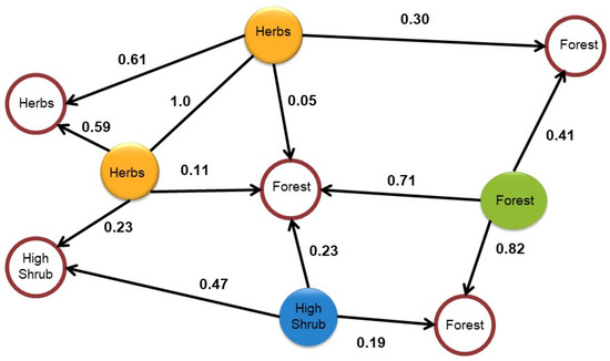 To depict the idea of label propagation, a graph is shown in Figure 4 representing a set of labelled and unlabelled samples. The labels are propagated from the labelled to the unlabelled samples based on the probabilities of the arrows. In this example, although two “Herbs” samples are connected to the unlabelled sample in the centre, it is labelled as “Forest” since the probability value of the “Forest” sample is higher than “High Shrub” and two “Herbs”.