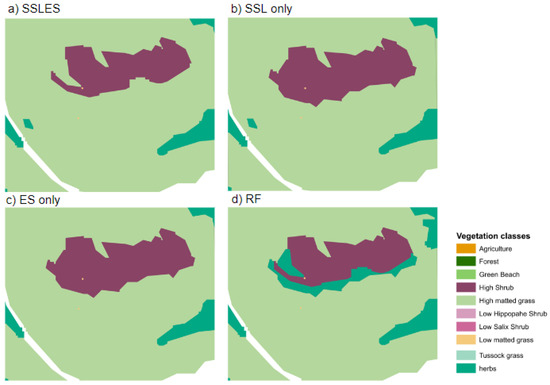 Example of classification result using (a) SSLES, (b) SSL only, (c) ES only, and (d) RF.