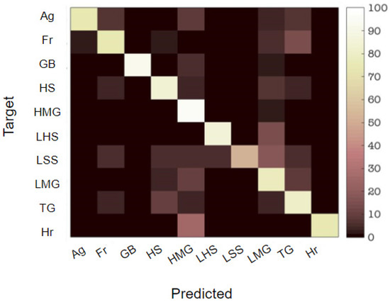 In Figure 8, the highest accuracy classifications have a light/white colour in the main diagonal and dark/black colour in the other cells, which means no misclassification.