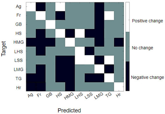 The obtained results in Table 6 show that SSLES can yield higher classification accuracy than SSL. Furthermore, using the red-edge bands provided the highest accuracy, which confirmed the findings of [3] where the importance of the Sentinel-2 red-edge bands for vegetation classification was highlighted. As is shown in Figure 8, a considerable number of “Herbs” are classified as “High matted grass”, and the classifier has confused the “Low matted grass” and “High matted grass” with other classes. This can probably be justified by (i) the high diversity of these two classes in the study area and (ii) the low diversity of training samples belonging to these classes. To gain better insight into SSLES’s performance and the advantage of using an ES integrated with SSL, the confusion matrix obtained from SSLES was subtracted from the one from the SSL, and the results are presented in a new matrix. In the resulting matrix, if the value of a cell increased, it is labelled “positive change”; if the value decreased, it is labelled as “negative change”; otherwise, the cell was given a “no change” label (Figure 9).
