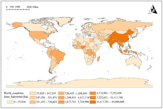 Global rice-harvesting areas of 2020 (Note: the data was collected from the Food and Agriculture Organization (FAO) website).