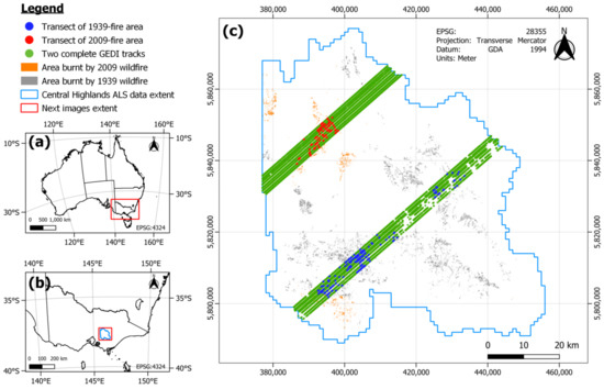 Map of the study area within (a) Australia and (b) the state of Victoria. The main map (c) depicts two tracks of GEDI footprints (green) used for the landscape level analysis. GEDI footprints that overlap mountain ash forest areas burnt in 2009 and 1939 are displayed in red and blue, respectively. The outline polygon in blue showing the study area is the forested area covered by an airborne LiDAR scanning (ALS) survey project in the Central Highlands of Victoria in 2015–2016 carried out by the Victorian Department of Environment, Land, Water, and Planning (DELWP).