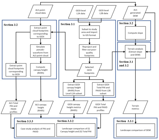For this study, the initial steps were the acquisition and processing of the GEDI and ALS datasets to derive the metrics of interest (canopy height, PAI, PAVD, and elevation) for comparison. This was followed by carrying out a statistical analysis of their accuracy at two scales: one at the landscape level using all the sample GEDI footprints (for the canopy, height, PAI, and elevation); and for the other, a case study was done for two age-classes of mountain ash forests (for the PAVD profile and PAI). The overall methodology for the comparative accuracy analysis of the ALS and GEDI sensors for the metrics of interest is shown in Figure 2 and described below.
