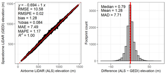 The scatterplot of GEDI and ALS-derived elevation values shows a strong linear relationship (R2 = 1.00), with more variability in the medium elevation range (Figure 3). The MAE is 7.49 m and the RMSE is 10.58 m with a bias of 1.28 m. The percentage errors were small (<5%) for the %bias, RMSPE, and MAPE (Figure 3). The histogram of the distribution of elevation residuals (ALS, GEDI) shows a median error of 0.79 m, mean error of 1.28 m, and a MAD of 7.71 m. Overall, there is a strong agreement between GEDI and ALS elevation, with GEDI over-estimating the reference elevation by a mean of 1.28 m.