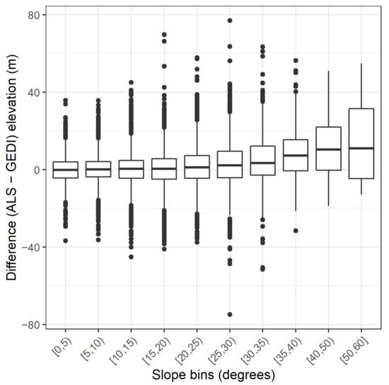 Upon examining the variation of elevation errors with slope (Figure 4), it can be seen that the median error increases with the slope once a threshold of around 20 degrees is crossed. Below this threshold, the median of the elevation error is low and remains close to zero for the first four slope bins between 0 and 20 degrees, i.e., 0–5, 5–10, 10–15, and 15–20 m.