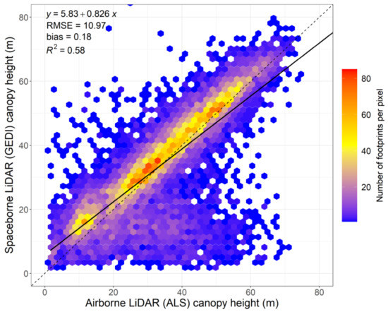 Scatter plot of ALS and GEDI canopy height values (RH95 or 95th percentile of cumulative return energy) for all individual footprints (11,832). The 1:1 line is shown (dashed); the color of the pixel (legend) represents the number of footprints having a common value of canopy height.