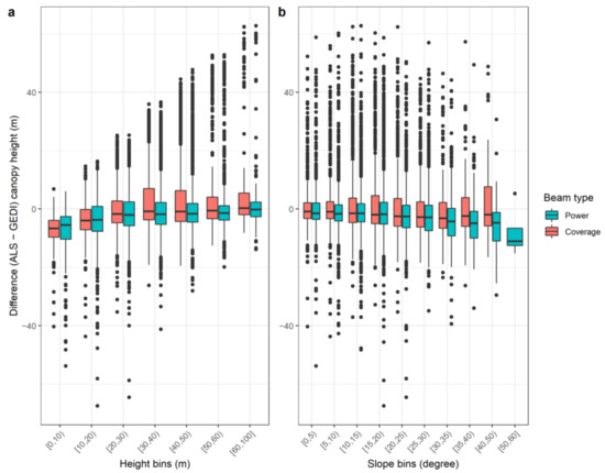 The differences between the two sensors (ALS, GEDI) at different canopy height and slope ranges was then investigated to examine the variance in error of the two methods when measuring different forest heights or under varying complexities of terrain. To do this the footprints were grouped into different height and slope classes. The canopy height classes were grouped using their ALS canopy height values, with 7 groups from: 0–10 m, 10–20 m, 20–30 m, 30–40 m, 40–50 m, 50–60 m, and >60 m. The effect of terrain slope was investigated with the same intervals as described in the DEM analysis (Section 3.3.1), with group classes from 0 degrees to 60 degrees. In addition to this, the beam type (power or coverage beam) was isolated to investigate the effect that the use of different beams has on the accuracy.