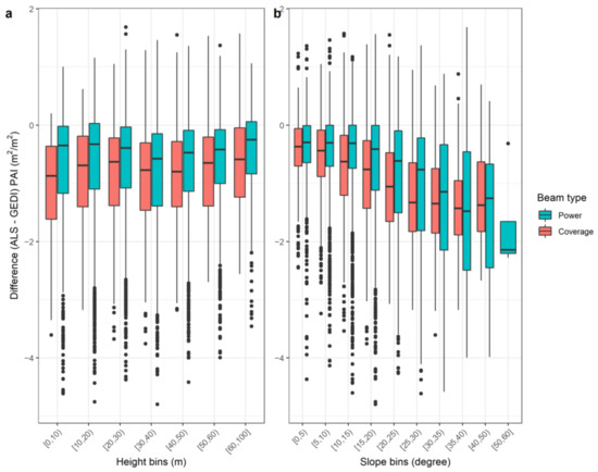 For the total PAI values, the ALS and GEDI values show poor agreement, with only 16% of the observed variation in ALS PAI values explained by the GEDI values. The RMSE is 1.21 m2/m2 and the bias is 0.87 m2/m2. GEDI generally overestimates the total PAI with a median value of −0.55 m and MAD value of 0.78 m. The accuracy of the power beams is found to be better than the coverage beams for total PAI. The absolute accuracy is low and remains stable (median value of ~0.50) for all canopy heights, and only improves significantly to 0.39 for a tall canopy with heights above 60 m. For increasing terrain slopes, the absolute accuracy degrades consistently from a median value of 0.32 for the lowest slope bin to a maximum of 2.13 for the highest slope bin. For the vertical PAVD profile, the error is found to be significant below a 30 m canopy height threshold. Above this threshold, the GEDI replicates the reference ALS vertical PAVD profile well.