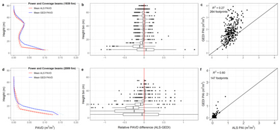 Footprints from the two tracks of GEDI footprints were selected (Figure 1b,c), one for each age-class of forest resulting from being burnt during the wildfires of 1939 (transect of 1939 fire) and 2009 (transect of 2009 fire). For each age-class (1939 and 2009), the following analysis was carried out. The PAVD profiles were qualitatively assessed at the same height bins using a set of two figures showing: (a) PAVD profile curves for each sensor (ALS and GEDI), (b) boxplots showing the differences between the two sensors at height interval bins of 5 m, and (c) a 1:1 scatter plot of GEDI and ALS PAI values.